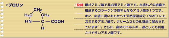 周知のように、皮膚は体表面より表皮、真皮、皮下組織の3層構造をなし、表皮はさらに角質層、透明層、顆粒層、有棘層、基底層から構成されている。角質層は角質細胞と細胞間脂質からなり、角質細胞はケラチン線維と線維間物質で満たされている。線維間物質は天然保湿成分(NMF)とも呼ばれ、角質層の保湿性を維持し、ひいては皮膚の健常性を保つうえで重要な役割を担っている。このNMFの主成分の1つであるピロリドンカルボン酸(PCA)はグルタミン酸から作られる代謝産物で、高い吸湿作用および保湿作用を有する。また、NMFの約40%を占めるアミノ酸の中で、プロリンは乾燥状態での保水力がアミノ酸の中で最も高いことから、PCAと配合することで相乗的に吸湿性を高めることが知られている。