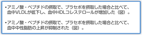 1)アミノ酸・ペプチドを摂取することにより、プラセボ摂取と比較して、血中のVLDLが有意に低下し、HDLコレステロールが有意に増加した。